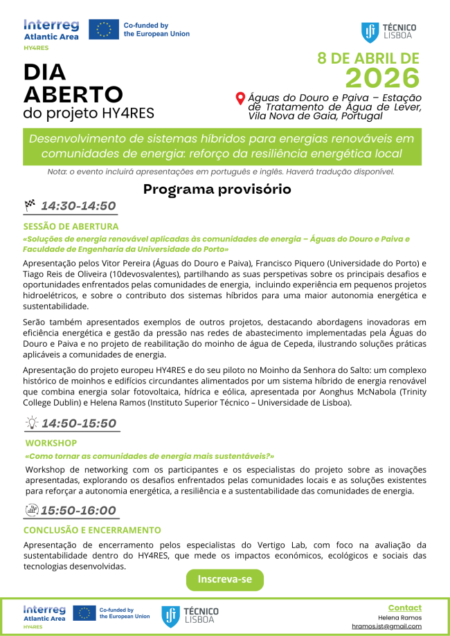 👉 Visão geral do piloto HY4RES: apresentada por investigadores do Trinity College Dublin e do Instituto Técnico – Universidade de Lisboa, fornecendo contexto sobre o foco da tarde nos sistemas híbridos e o seu papel no apoio às comunidades energéticas locais.